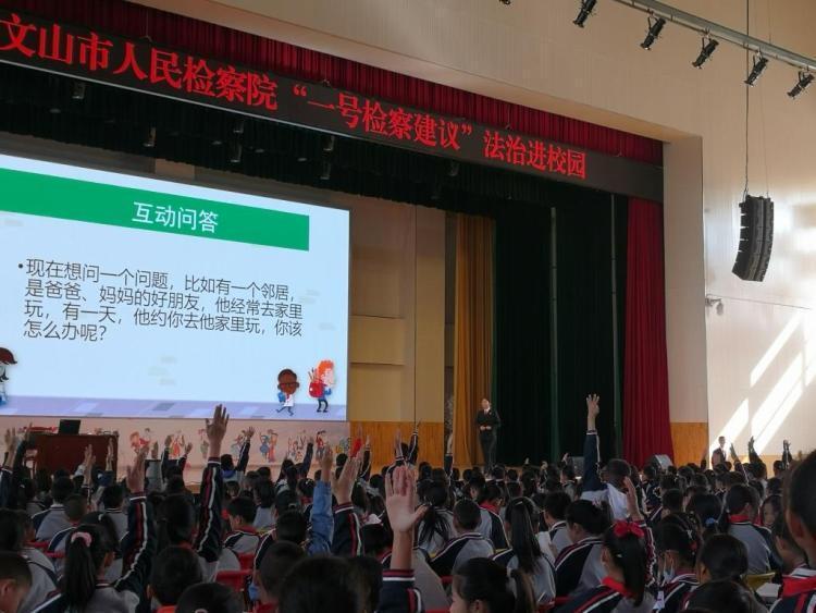 为深入推进“一号检察建议”法治进校园工作开展,进一步加强未成年人工作力度,提高未成年人自我保护意识,创建平安和谐校园。11月13日,由文山市检察院宣讲小分队走进文山实验小学城北校区,为六年级的同学们带来一场关于预防性侵的专题法治教育宣讲活动。