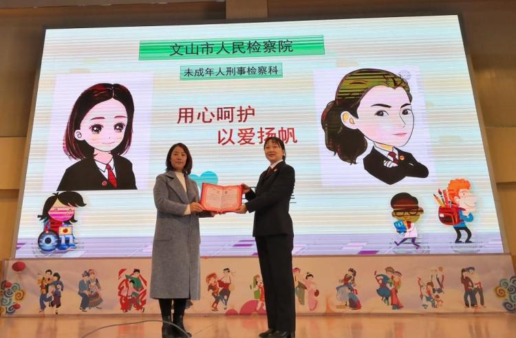 宣讲结束时,文山实验小学城北校区校方给副检察长马舒颁发法治副校长的聘书。