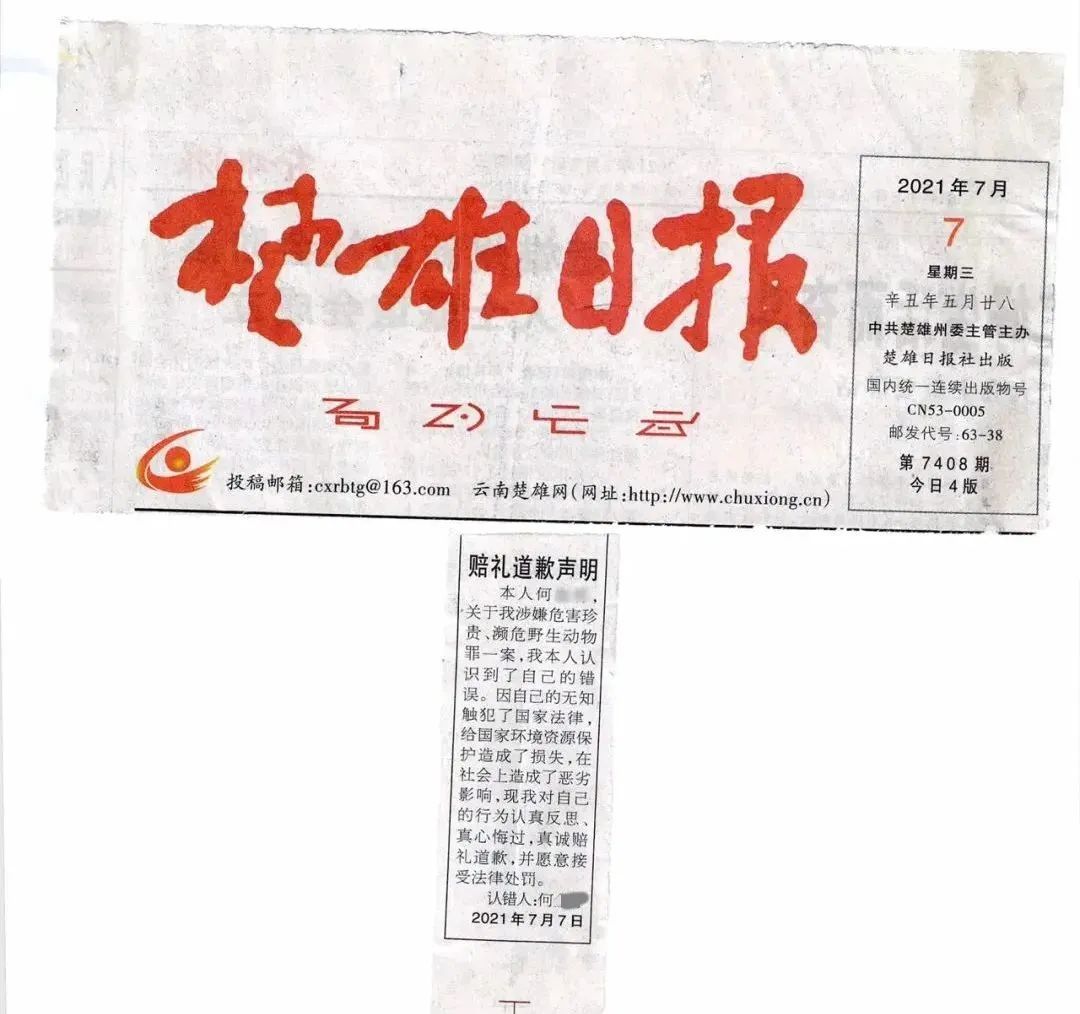 惩防并举,筑起保护屏障。2021年7月16日,楚雄市法院刑事审判庭对何某危害珍贵、濒临野生动物一案进行了公开宣判,依法判处何某有期徒刑二年六个月,并处罚金一万元;没收其非法收购的野生动物制品和作案工具;赔偿国家野生动物资源损失费9000元,并在报纸上公开声明赔礼道歉。