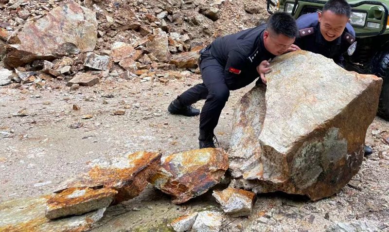 巡逻车行至半路就停了下来,在暴雨天气影响下,路段出现塌方,山上的落石如雨点般掉落。谢金毅和同事用最快的速度清理碎石后继续出发,之后再遇到碎石,又立马下车清理……就这样一路走走停停,还没到步巡的路段,他们早已汗流浃背。