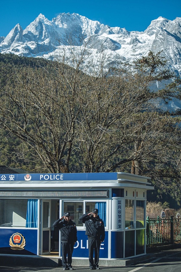 12月的那场初雪之后,我们决定上玉龙雪山去看看。从冰川公园坐着索道往回走的时候,碰巧与玉龙山派出所的所长杨春龙在同一个缆车车厢中,当时他正处理完一起游客遗失手机的警情准备回所里。索道下行的途中,杨春龙一边娴熟地给同车厢的游客介绍着云杉坪、牦牛坪等周边景区的游览路线,一边掏出手机拍着窗外的澄澈雪景。“警察同志,你们每天上好几趟雪山,还没看腻吗?”游客问道,“怎么会腻呢?每天的雪山都有不一样的美。”杨春龙笑着回答。