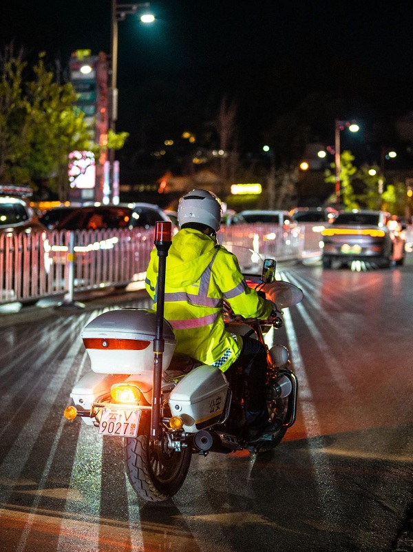 警用对讲机里传来突发警情需要支援的消息,赵文灿骑上摩托便迅速赶去事故现场,我们的镜头只来得及拍下他匆忙离去的背影。他身后那川流不息的车辆、摩肩接踵的游客、骑着电动车为生活奔波的外卖员……都是他们在寒夜中坚定守护的意义。