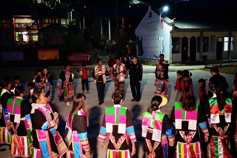 阵阵雄亮的山歌,打破村庄宁静的夜晚。乌木寨社区马鹿塘傈僳村寨的小伙子、大姑娘能歌善舞,每当夜幕降临,他们就会载歌载舞,用山歌表达对生活的赞美,用舞蹈道出春天的喜悦。到场的移民管理警察纷纷加入“打歌”队伍中,这是保山边境管理支队木城边境派出所“双语宣传小分队”向村民传达全国两会精神前的精彩一幕。