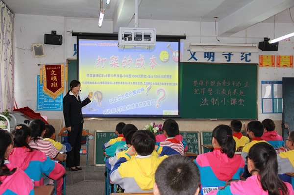 “法制小课堂”活动是基地开展“六五”普法期间加强青少年法制教育的一项创新举措。此次活动充分发挥了学校教育的主渠道作用,深入推进法制教育进课堂,将法制课列入学校教学内容,并由学校做出具体安排,把教学时间编入学生课时表,在周一至周五与其他课时同步进行。此外,“法制小课堂”活动还大胆采用“一对一”的全新教学模式,即由基地的一名讲解员深入一个班级,借鉴青少年课堂教育的表现形式,以青少年容易接受的传播方式和互动形式,把法治理念、法律知识以及爱国主义教育、社会主义核心价值观教育、安全教育等十大基础教育巧妙的融合进去,确保对每位学生的法制宣传教育工作真正做到入耳、入脑、入心。