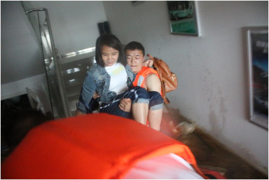 11时05分,大队接到报警称,文山市城南亚太车城环东路雪弗兰4S店,遭到水淹险情,有1名员工被困店内,情况危急。接到报警后,大队立即出动1辆消防车7名消防官兵前往救援。到达现场经消防官兵侦查发现,因该地地势低洼,加之长时间的大量降水导致该院内大量积水无法排除,导致车店被淹,1名员工未及时逃脱,被困在店铺二楼上,根据现场情况,指挥员迅速命令救援人员对受淹区域进行断电处理,并利用橡皮艇横渡进店内对被困群众实施救援,经过30分钟的紧张救援,消防官兵终于将被困群众转移到安全地带。