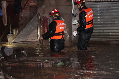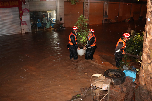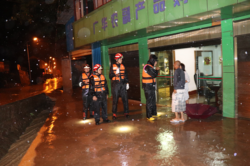 6月4日22时30分,普洱市镇沅县突降暴雨,强降水量达到32.8毫米,城区内多处发生内涝、河水暴涨等情况,群众出行严重受阻。镇沅消防大队立即启动抗洪抢险救援预案,备齐救援装备,第一时间处置突发状况。