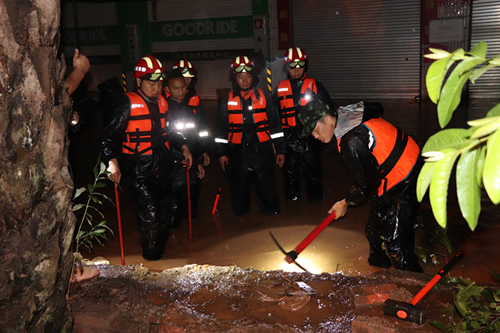 23时10分,镇沅消防大队接到群众报警称,由于连续大量降雨,县中岩汽车修理厂因下水道堵塞导致严重积水,危及群众生命财产安全。接警后,大队立即出动1车8人赶往现场处置,23时15分,官兵到达现场后,经勘查发现,由于长时间的降雨和地势低洼,中岩汽车修理厂内早已是一片汪洋,最大积水深度70多厘米。得知情况后,指挥员立即组织官兵利用撬棍、铁锹等器材,清理堵塞排水口的垃圾,并用撬棍协力打开了下水道井盖,23时50分,待积水水位大幅下降,排除危险后,官兵立即收整器材归队。至此,整个救援行动圆满结束。(王学同)