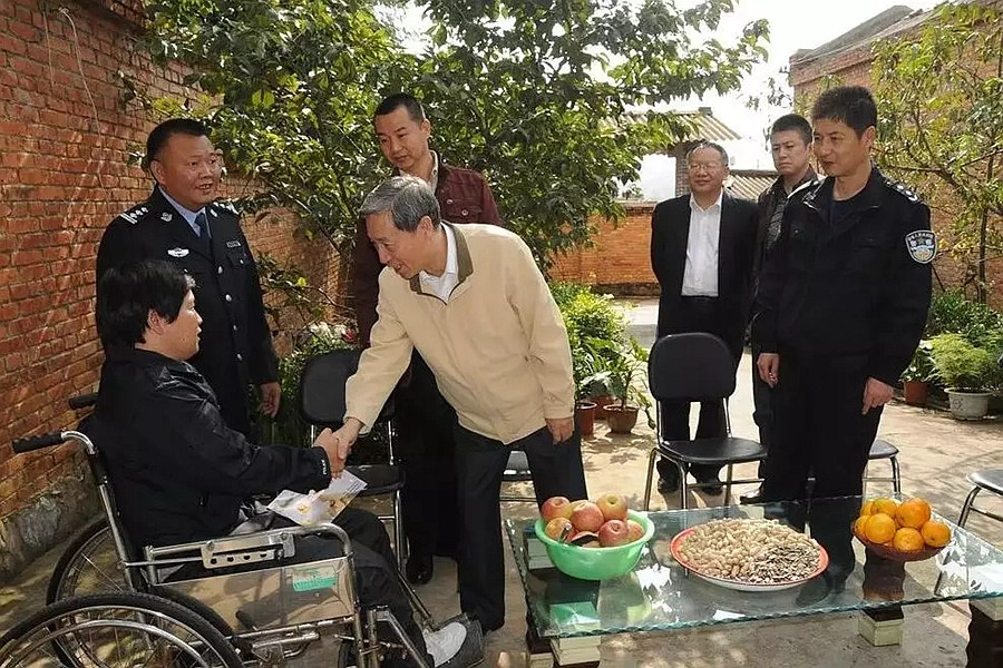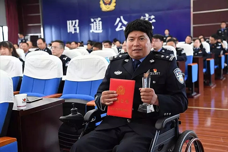 在昭通市鲁甸县公安局,有一位坐着电动轮椅上下班的民警,他以自己的一言一行感染身边的每一个人,更以不向命运低头的大无畏精神鼓舞着警队,他,就是被中国公安民警英烈基金会会长孙明山称赞为“身残志坚好民警”的鲁甸县公安局法制大队信访室民警——冯玉邦。