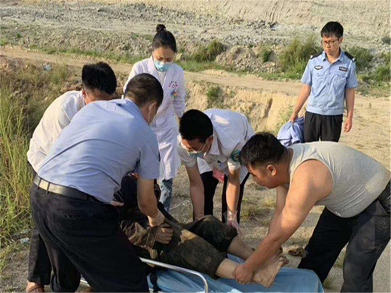 到达地点后,3位出警人员立即展开搜救,经过半个多小时的紧急搜寻,终于在山坡下的一条小沟边上找到了老人。此时,这位老人已经虚弱地躺在地上,表情十分痛苦,感觉快要奄奄一息了,身上都是泥土,脚上的鞋子也只剩下一只,脚踝上还有划破的伤口。当时老人口齿不清,听口音不是本地人,出警人员没能与其沟通交流。民警杨阳用矿泉水滴湿纸巾,轻轻擦去老人身上的泥土和伤口周围的血丝,并迅速拨打120急救电话急救。