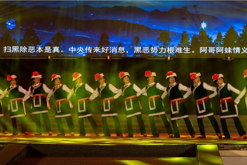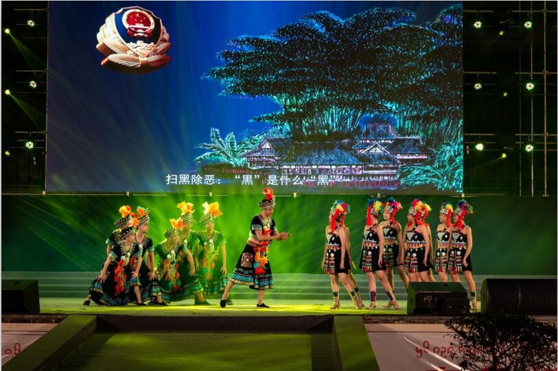 “听一听,什么是恶?哨多哩来给你表一表:垄断资源黑村官,宗族大,势力强,欺压百姓土霸王,破坏选举和换届,勒索厂矿和企业……”民族歌舞快板朗朗上口;节目《扫黑除恶——歌唱美丽家园》《拉祜山歌弹唱》《公安宣讲到我家》,分别用章哈小戏、三跺脚、花灯舞蹈的形式将扫黑专项斗争的重大意义、基本原则、目标任务、主要打击哪几类“黑恶”势力、什么是“黑”“恶”势力、什么是黑恶势力“保护伞”等知识融入节目中,对仗工整节奏明快的歌词,少数民族特色舞蹈,深得观众喜爱;小品《村民的权益》《夜市风波》分别演绎了利用家族、宗族势力横行乡里、称霸一方、欺压残害百姓、操纵破坏基层换届选举的“村霸”和在夜市欺行霸市、收保护费的“市霸”最终被绳之以法,语言诙谐、笑意横生,令观众拍手叫绝;配乐诗朗诵《使命与誓言》歌舞《人民公安向前进》歌曲《扫黑除恶之歌》等作品也大受观众欢迎点赞。
