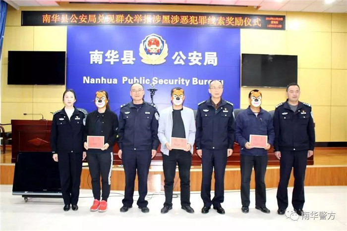 南华县公安局 奖励举报涉黑涉恶违法线索群众3人,奖励人民币15000元。