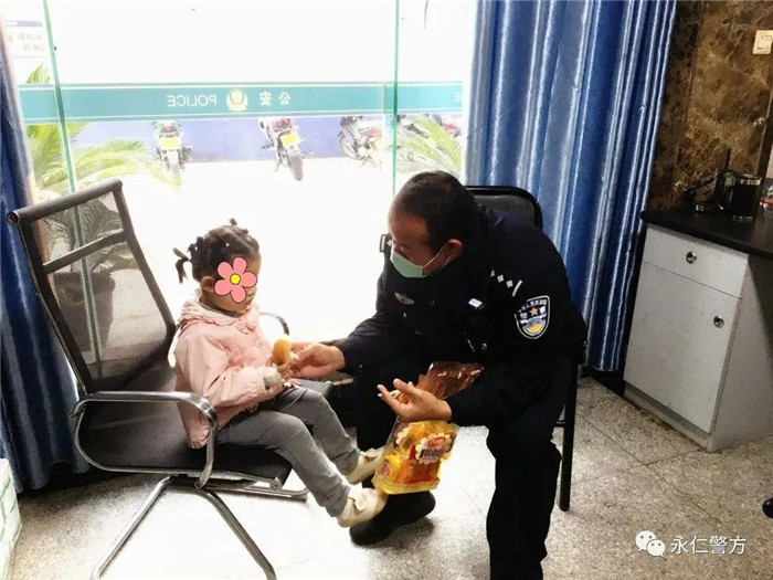 在派出所,民警细心地带着小女孩去洗手,并拿出点心给小女孩吃。小女孩似乎吃得很开心,精神状态也很好,民警这才放下心来,迅速通过各种渠道联系孩子的家人。