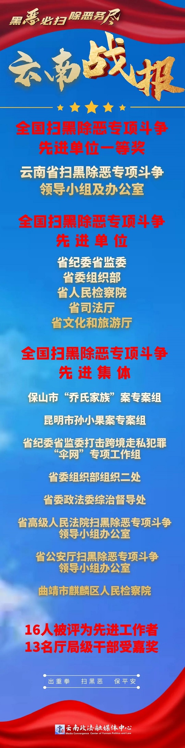 3月29日,在全国扫黑除恶专项斗争总结表彰大会上,云南省扫黑除恶专项斗争领导小组及办公室被评为全国扫黑除恶专项斗争先进单位一等奖。省纪委省监委、省委组织部、省人民检察院、省司法厅、省文化和旅游厅5个单位被评为全国扫黑除恶专项斗争先进单位。保山市“乔氏家族”案专案组、昆明市孙小果案专案组、省纪委省监委打击跨境走私犯罪“伞网”专项工作组、省委组织部组织二处、省委政法委综治督导处、省高级人民法院扫黑除恶专项斗争领导小组办公室、省公安厅扫黑除恶专项斗争领导小组办公室、曲靖市麒麟区人民检察院8个集体被评为先进集体。16名个人被评为先进工作者,13名厅级领导干部受到嘉奖。我省受表彰嘉奖数量位居全国前列。