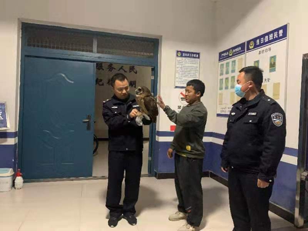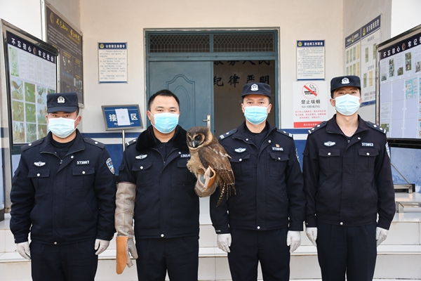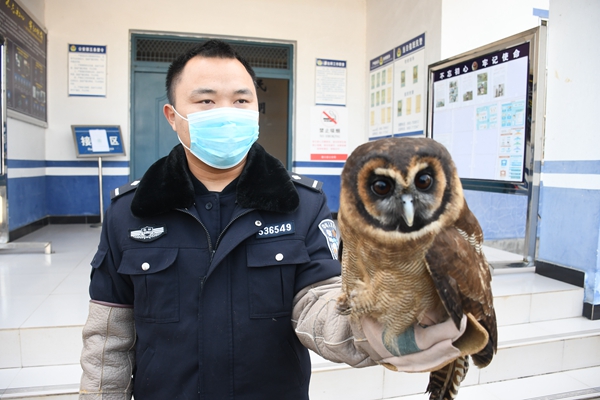 到了派出所后,民警小蒋上前查看,立即意识到这可能是一只珍稀的国家保护动物。于是一边采取措施,将这只大鸟转移到室内悉心照料,一边根据其外貌特征在网络上查找相关信息。经过与网络资料的仔细对比,初步判断其为国家二级保护动物猫头鹰,具体属于哪一系还待专家查证。民警小蒋随即与户撒森林派出所取得联系,并赶往森林派出所交接给他们。