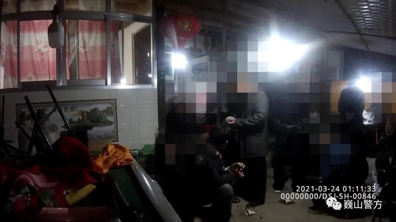 巍山县公安局五印派出所民警:“3月23日深夜,我们五印派出所根据‘110’指令,在辖区白乃村委会某社一农户家中,现行查获正在以‘摇宝’方式进行赌博的涉赌人员20名,其中还有7名是女性,扣押赌资4万余元。”