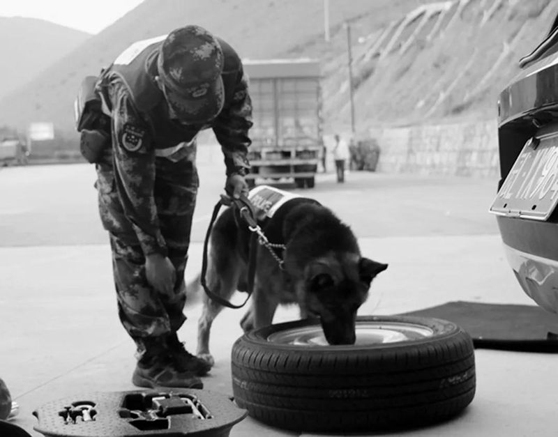 2017年5月17日,对于滨哒来说,是收获荣耀的一天。当天,执勤人员对一辆过往皮卡车及驾驶人进行例行检查时,发现该驾驶人神色慌张,形迹可疑,但在车内没有查到任何可疑物品。随后,在训导员的指挥下,滨哒对皮卡车每个部位进行详细检查,当检查至备用轮胎时,滨哒做出“趴下”的示警反应。随即将轮胎放至单位“X”光机扫描仪检查,发现轮胎内装有许多块状可疑物,经拆开检查,执勤人员当场从轮胎内查获海洛因45块,净重15.71公斤。因表现突出,滨哒被评定为二级功勋犬。