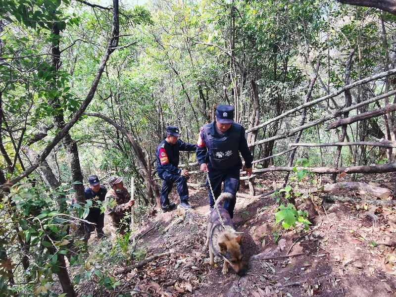 下片马村千山万壑、林密草深,仅仅靠民警的双眼是很难发现隐匿在树丛深处的非法出入境人员的,为此所里在“外防输入”防控工作开展以来,按照警力不够家犬来助的思路,在执勤点配备家犬,协助执勤人员开展工作。