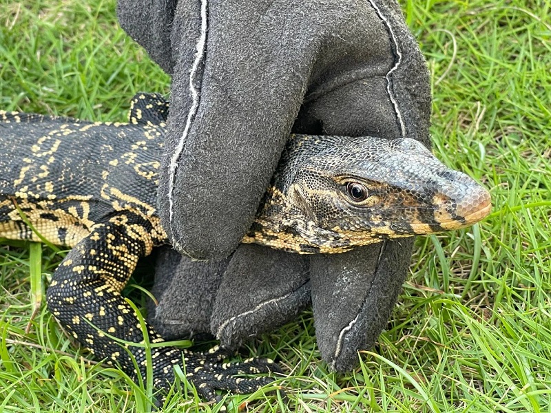 经了解,当天下午,岩来骑摩托车从农田返家途中,发现一只既像蛇又像鳄鱼的动物趴在公路中间,一动也不动,停车查看,原来是一只蛤蚧(巨蜥),由于担心蛤蚧(巨蜥)被过往车辆碾压致死,于是将其带回家中并联系了森林警察。
