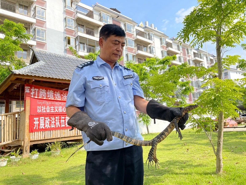 5月17日,曼稿大队值班民警接到村民电话报警称:他在路上捡到一只蛤蚧,请森林警察赶快前来救助。接警后,民警立即驱车前往勐海县勐遮镇曼恩村委会曼晃村岩来家中,民警到达后,90后热心村民岩来将一只幼年巨蜥移交给民警。