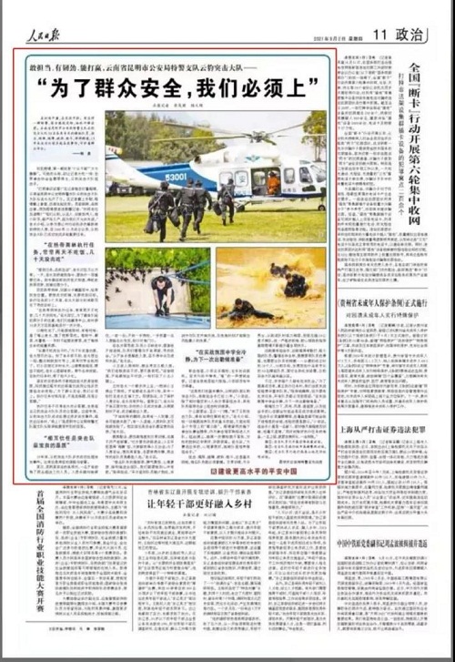9月2日,《人民日报》11版以《为了群众安全,我们必须上》为题刊发报道“敢担当、有韧劲、能打赢”的云南省昆明市公安局特警支队云豹突击大队事迹。