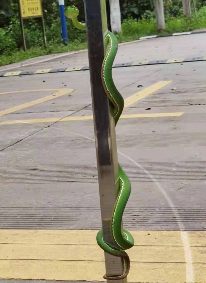 民警周号淇下意识地立即定住了脚步,回过神来定睛一看,正前方距离自己不到2米的地方,一条1米多长的竹叶青横躺在巡逻道的中间,正一动不动地盯着他看,不停地吐着蛇信,不时发出“滋——滋——滋”的声音。