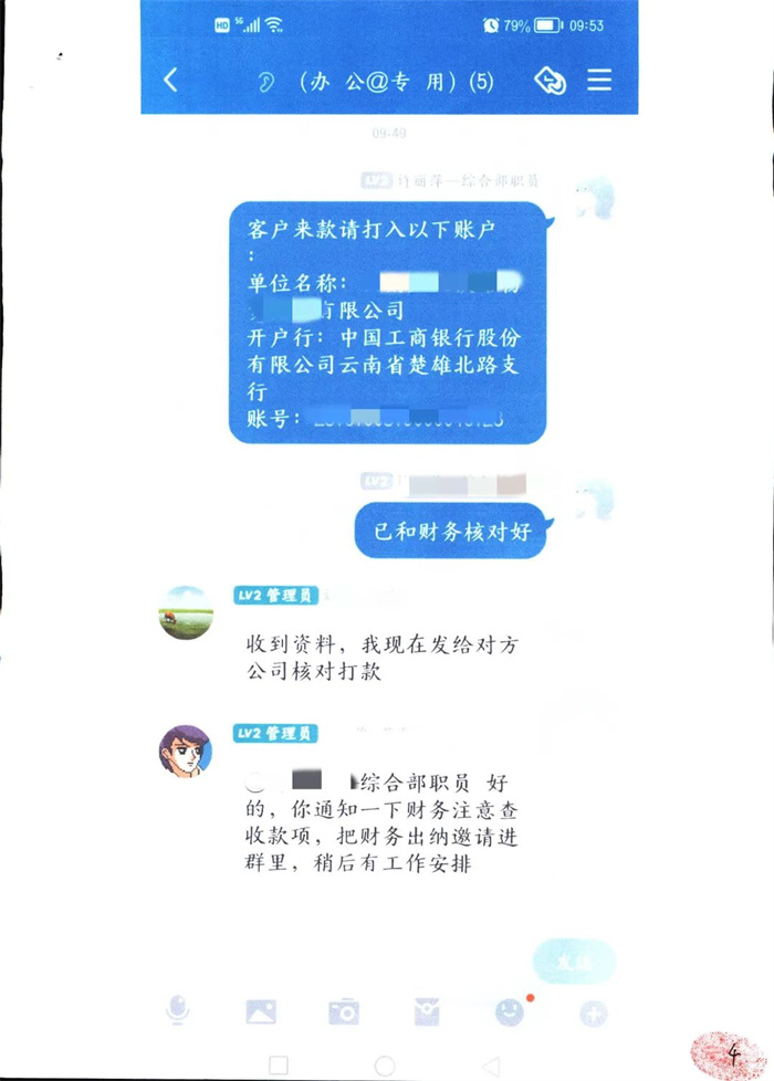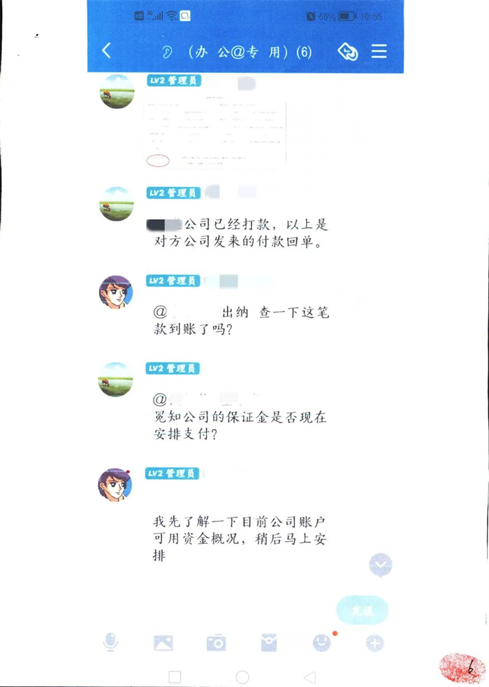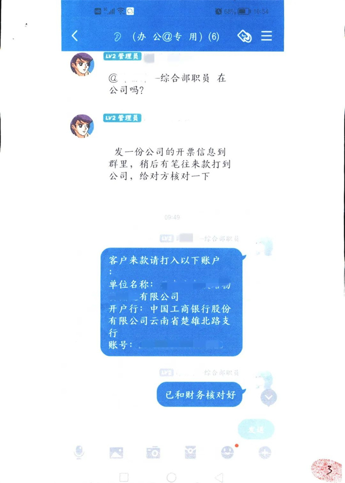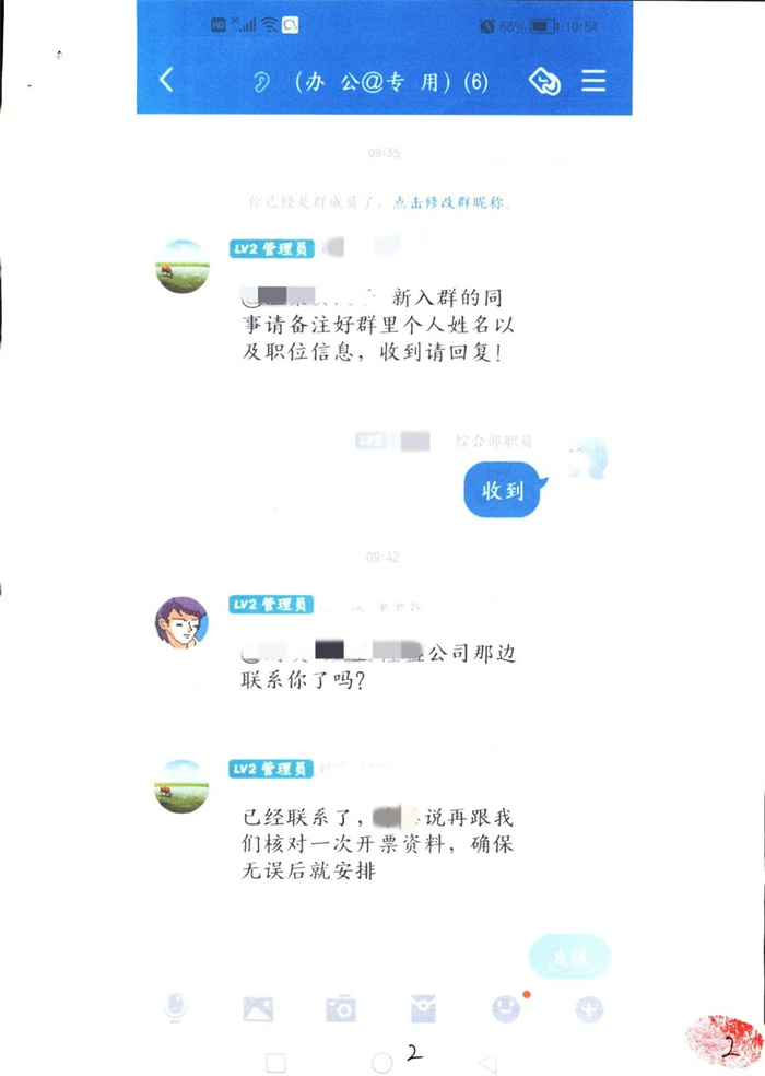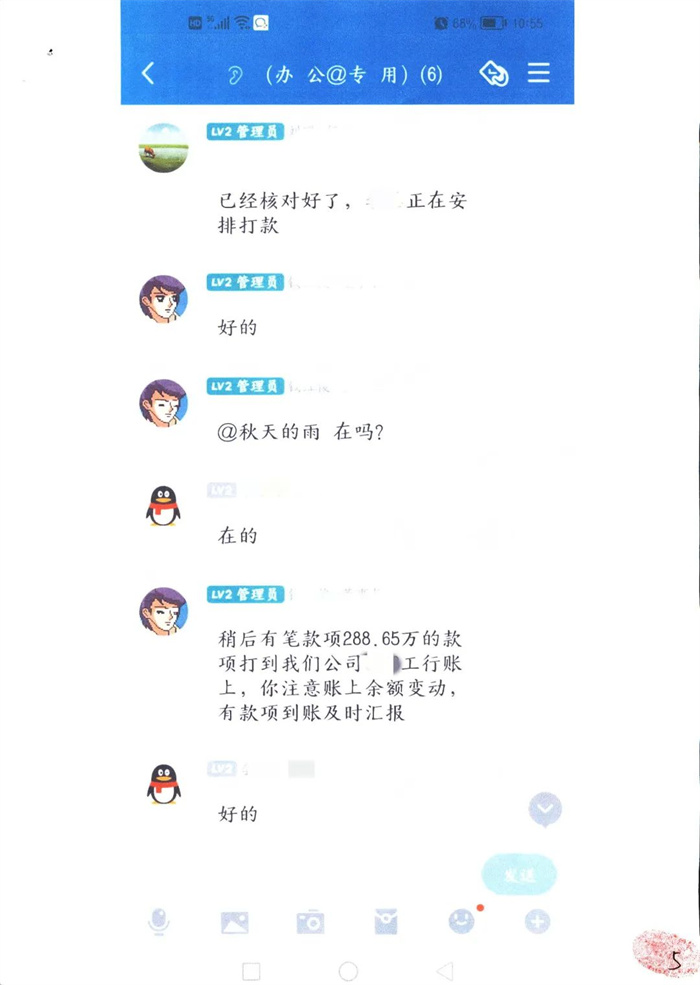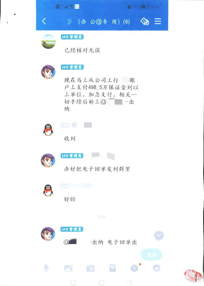 在聊天群内,几名“领导”煞有介事地讨论公司日常业务情况,要求许某在群里发开票信息,很快有一笔款项打到公司账上。随后许某就打电话给财务要了开票信息发在群里,按照“董事长”要求把公司出纳李某拉进QQ群。