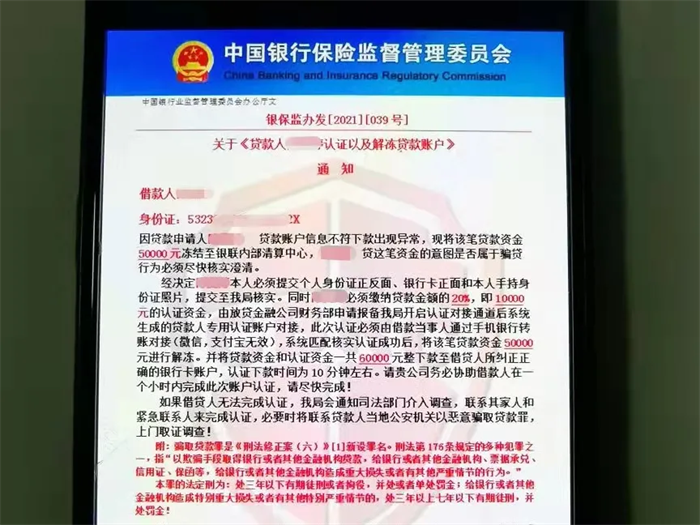 “客服”发来一份“中国银行保险监督管理委员会”通知,威胁陈女士若一小时内未完成认证,公安机关将以恶意骗取贷款罪上门取证调查。陈女士瞬间慌了神,正准备向“客服”指定账户转账时,嗅觉敏锐的警方迅速赶到敲响了门。