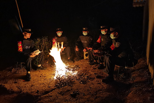 深夜中,帐篷外,民辅警围聚在火堆旁,诵读党史,并相互提问,答不上来的则被“罚”做俯卧撑。