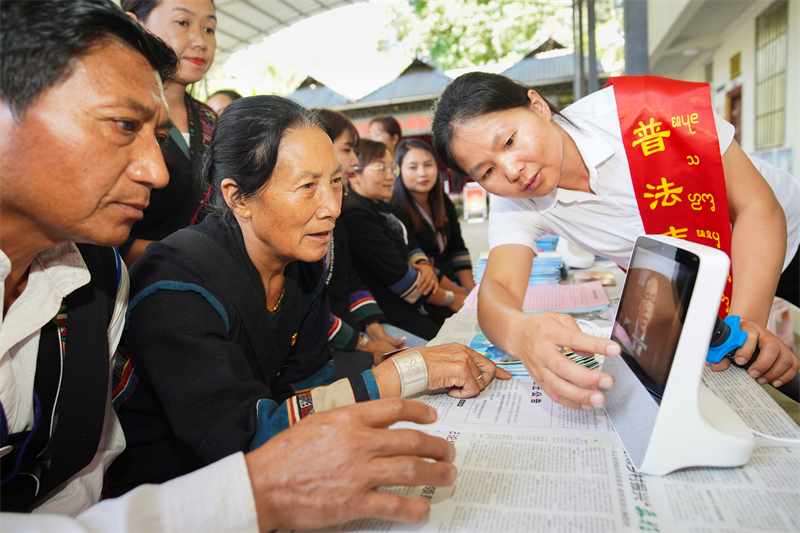 前不久,西双版纳州政法机关在勐海县南糯山村委会开展“乡村振兴 法治同行”主题活动,对全村干部进行“法律明白人”培训,推广“乡村法务通”公共法律服务机器人使用方法,参与活动的哈尼族群众现场通过公共法律服务机器人体验远程法律咨询。