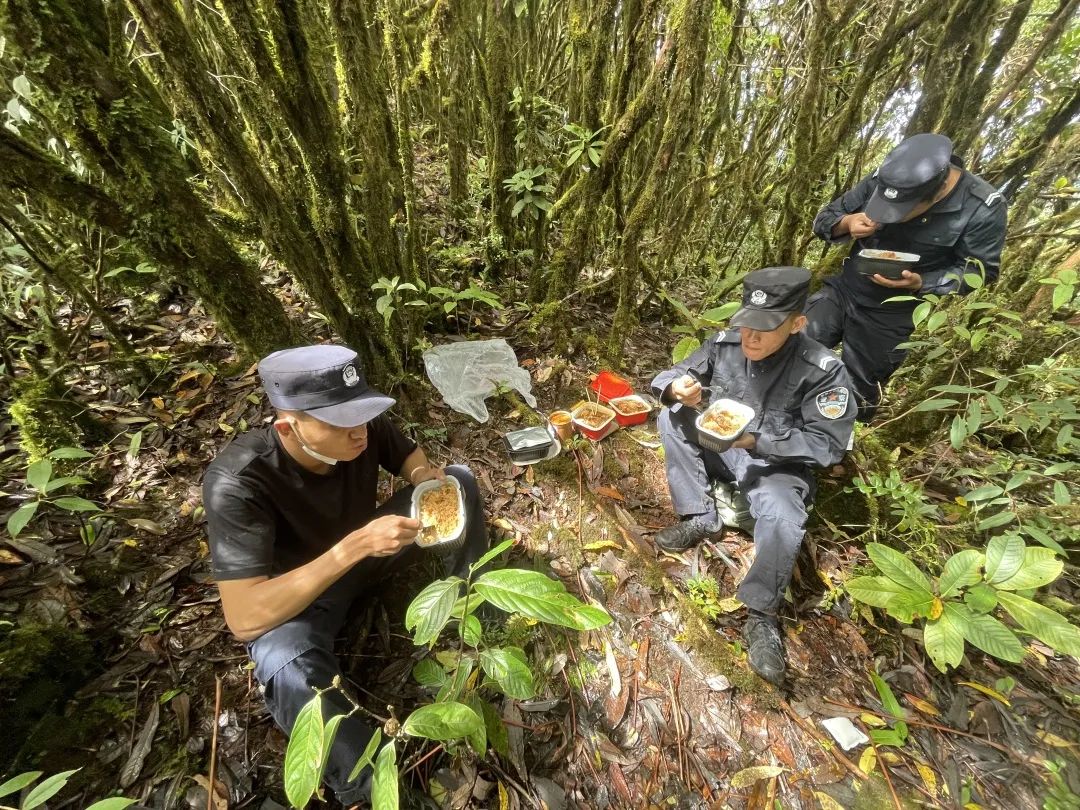 幸运的是,由于巡逻的次数多了,民辅警们都非常熟悉路线,即便在雾气笼罩中前行,也能准确找到方向。到了午饭时间,大家就在附近空地席地而坐,拿出自己背包里打包好的饭菜或自热米饭,简单休息后又继续前行。