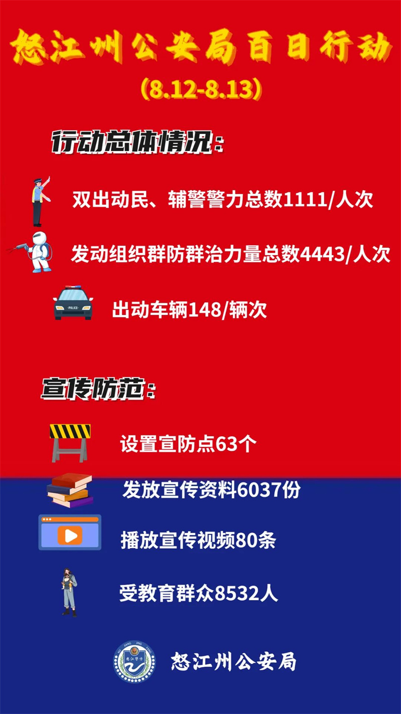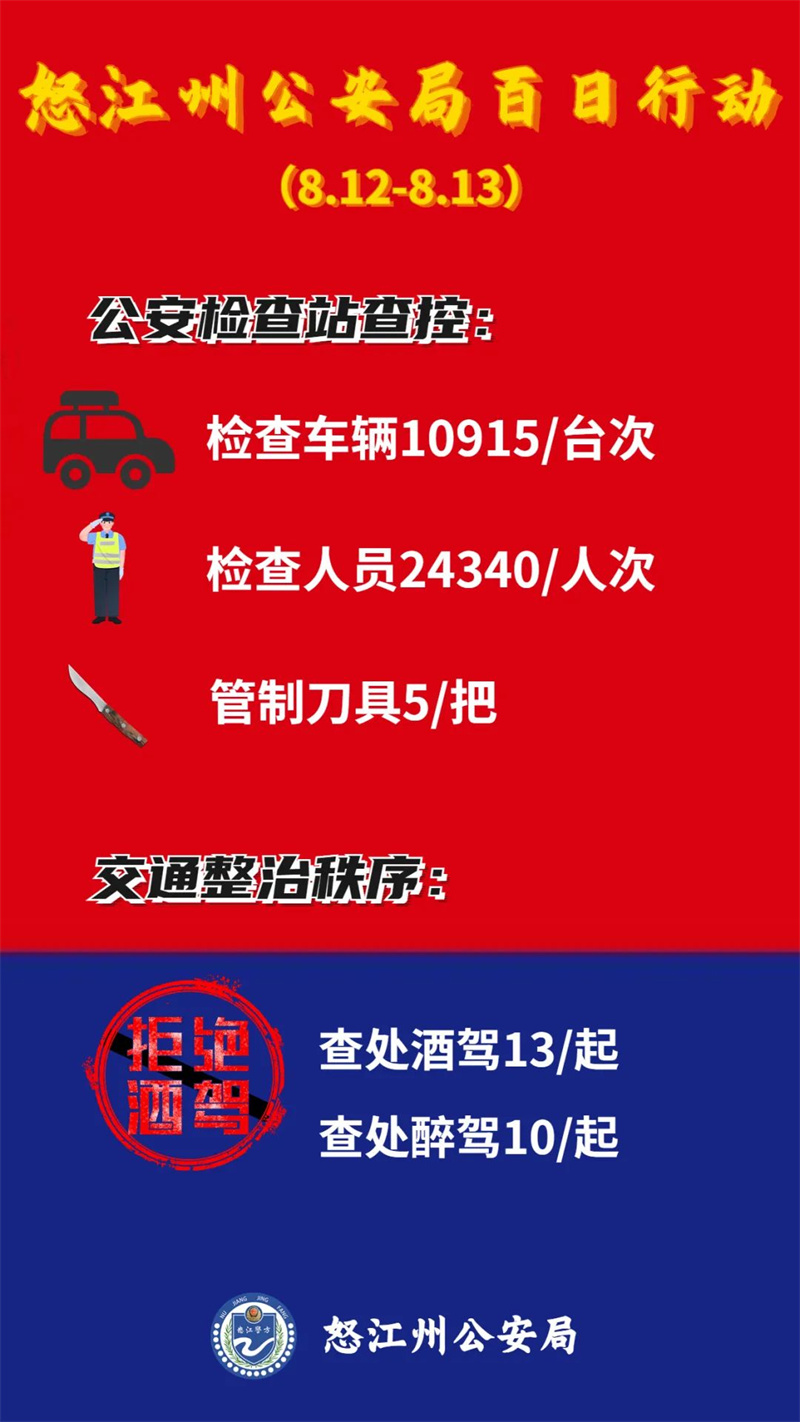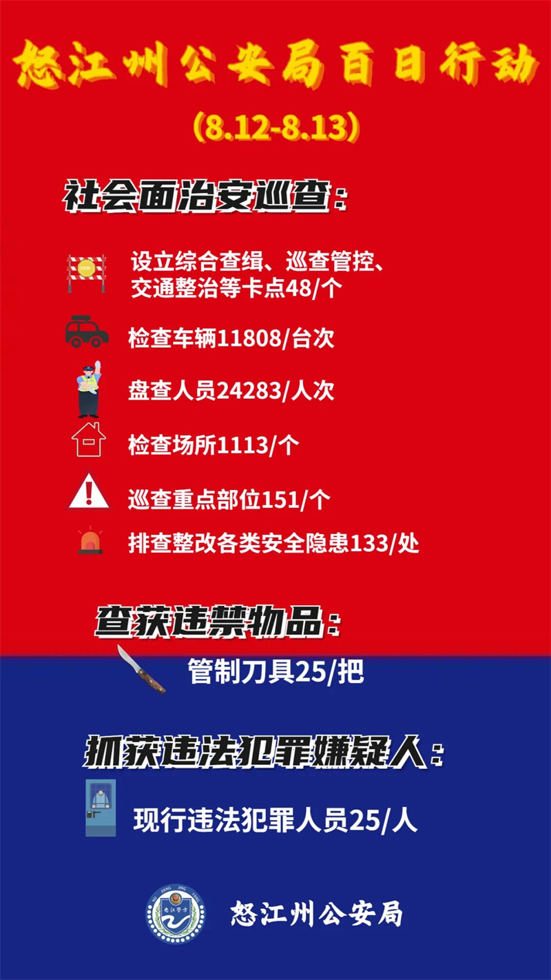 此次行动,怒江公安共出动警力1000余人次,发动组织群防群治力量4400余人次,出动车辆148辆次,设立查缉卡点48个,检查车辆1.1万余辆,盘查人员2.4万余人次,检查场所1113个,巡查重点单位151个,排查整改各类安全隐患133处,抓获各类违法犯罪人员21人,查获管制刀具25把。