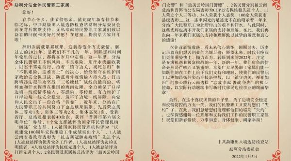 1月12日,普洱市勐康出入境边防检查站勐啊分站向全体民警职工家属寄去了一封春节慰问信。