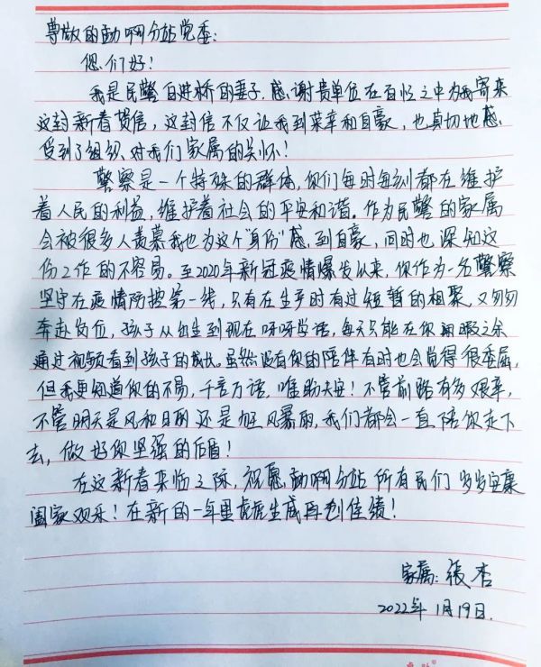 民警邵德燊的妈妈在信中写道:“‘儿行千里母担忧’这句古训说得很朴实,说出了无数母亲对儿子的无尽牵挂,道出了无数母亲对儿子深深的关爱,但我也明白岳母刺字、精忠报国的大义。春节来临之际,本该一家人团团圆圆的日子,你们为维护边境一线的安全稳定,履行你们的职责。作为家属我理解,也鼎力支持儿子的工作。”