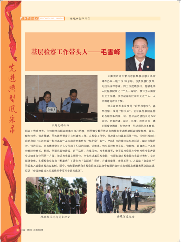 红河州蒙自市人民检察院检察长毛雪峰在办案一线工作30余年,以责任履行使命,用担当诠释忠诚。因工作成绩突出,他被最高人民检察院荣记“个人一等功”,被评为云南省先进工作者,多次被评为红河州先进个人、人民满意的政法干警。