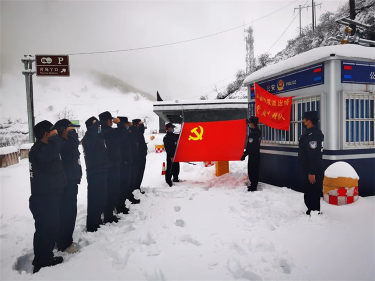怒江边境管理支队风雪丫口疫情防控执勤点民警进行重温入党誓词 邹德刚摄