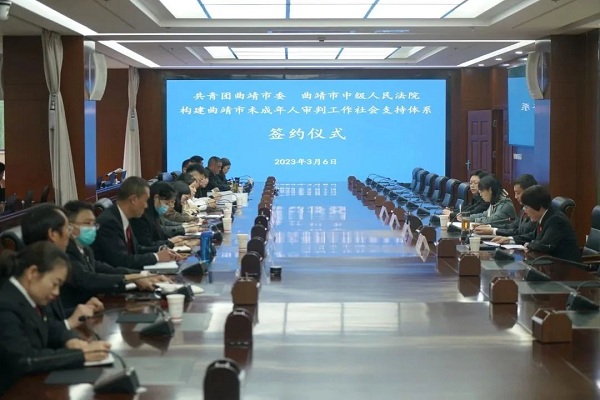 为加大教育感化挽救涉罪未成年人力度,保护救助未成年被害人,保护未成年人民事、行政合法权益,有效预防未成年人违法犯罪和侵害未成年人犯罪,进一步规范工作流程和质量标准,曲靖中院联合共青团曲靖市委签署“构建曲靖市未成年人审判工作社会支持体系”合作协议。