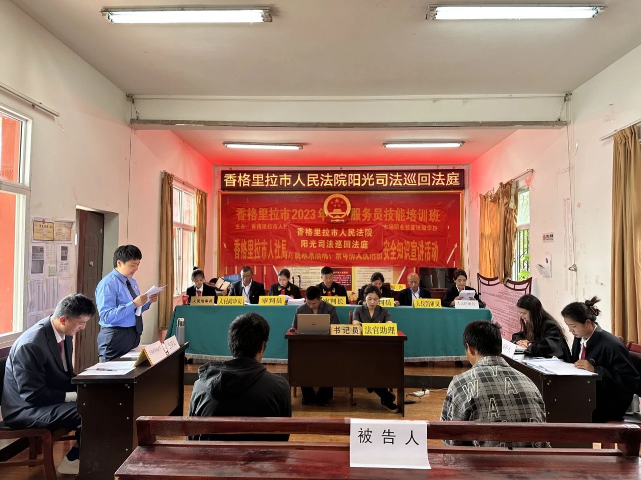 近日,迪庆州香格里拉市人民法院在金江镇仕达村委会,开庭审理和某某等犯盗伐林木罪一案。庭审采用“巡回法庭审理+庭后普法”的形式,将巡回法庭案件审理工作与普法强基补短板宣传活动有机结合,实现“1+1>2”的宣传实效。