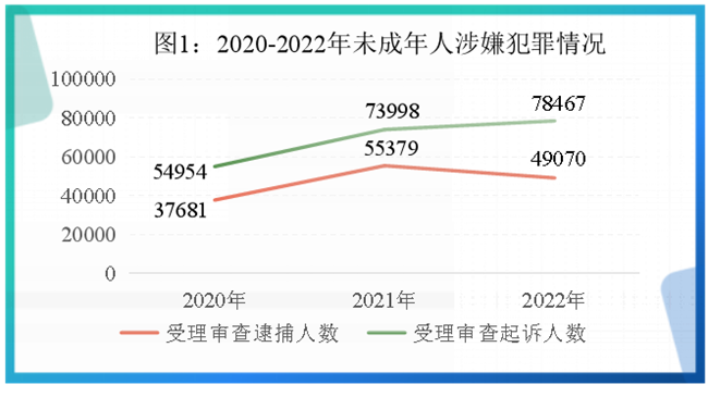 (1)未成年人犯罪总体呈上升趋势。2020年至2022年,检察机关受理审查逮捕未成年犯罪嫌疑人数分别为37681人、55379人、49070人,受理审查起诉未成年犯罪嫌疑人数分别为54954人、73998人、78467人,总体呈上升趋势。2022年受理审查逮捕、受理审查起诉人数较2020年分别上升30.2%、42.8%。