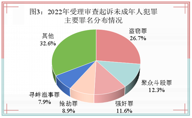 (3)未成年人犯罪类型更加集中。2022年检察机关受理审查起诉未成年人犯罪居前五位的分别是盗窃罪20966人、聚众斗殴罪9677人、强奸罪9122人、抢劫罪6983人、寻衅滋事罪6190人,占比共达67.4%。
