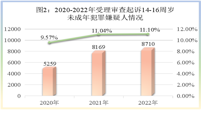 (2)低龄未成年人犯罪占比上升。2020年至2022年,检察机关受理审查起诉14至16周岁的未成年犯罪嫌疑人数分别为5259人、8169人、8710人,分别占受理审查起诉未成年犯罪嫌疑人总数的9.57%、11.04%、11.1%。