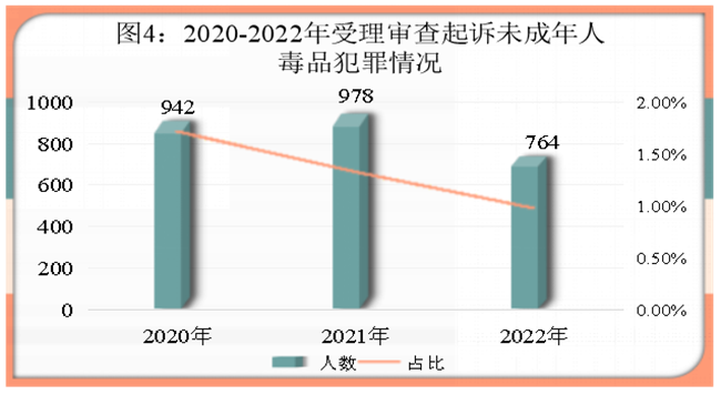 (4)未成年人毒品犯罪占比继续下降。2020年至2022年,检察机关受理审查起诉未成年人毒品犯罪人数分别为942人、978人、764人,分别占同期受理审查起诉未成年犯罪嫌疑人数的1.71%、1.32%、0.97%。