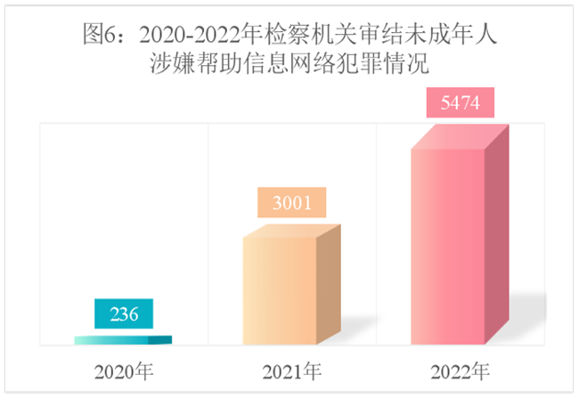 (6)未成年人涉嫌帮助信息网络犯罪活动罪明显上升。2020年至2022年,检察机关审结(含起诉、不起诉)未成年人涉嫌帮助信息网络犯罪活动罪犯罪人数分别为236人、3001人、5474人,2022年较2021年同比上升82.41%。