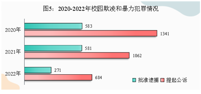 (5)校园欺凌和暴力犯罪数量持续下降。2020年至2022年,检察机关批准逮捕校园欺凌和暴力犯罪人数分别为583人、581人、271人,提起公诉人数分别为1341人、1062人、684人,呈逐年下降趋势。2022年批捕、起诉人数分别较2020年下降53.52%、48.99%。