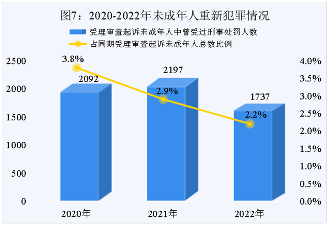 (7)未成年人重新犯罪率持续下降。2020年至2022年,检察机关受理审查起诉未成年人中曾受过刑事处罚的分别为2092人、2197人、1737人,分别占同期受理审查起诉未成年人总数的3.8%、2.9%、2.2%,反映对涉罪未成年人的教育挽救效果进一步提升。