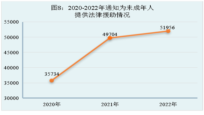 (1)未成年人法律援助制度落实有力。2020年至2022年,检察机关通知为未成年犯罪嫌疑人分别提供法律援助35734人次、49704人次、51956人次,年均上升20.58%。