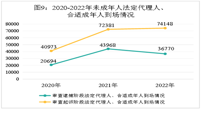 (2)未成年人法定代理人、合适成年人到场落实较好。2020年至2022年,审查逮捕阶段法定代理人、合适成年人分别到场20694次、43968次、36770次,审查起诉阶段法定代理人、合适成年人分别到场40973次、72381次、74148次。