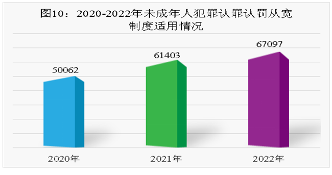 (3)未成年人犯罪案件认罪认罚从宽适用人数上升。2020年至2022年,检察机关对未成年人犯罪案件适用认罪认罚从宽制度人数分别为50062人、61403人、67097人,适用人数逐年上升。