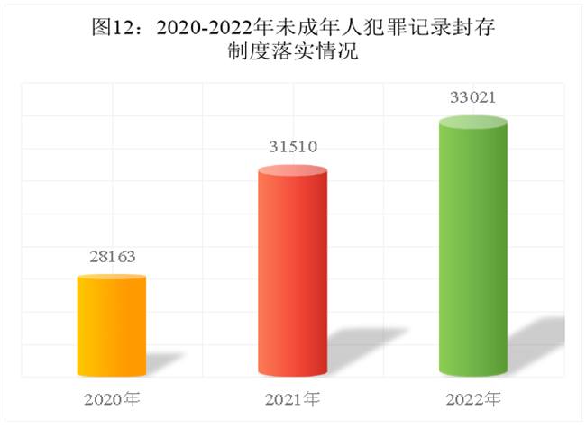 (5)未成年人犯罪记录封存制度进一步落实。2020年至2022年,检察机关共对符合条件的未成年人落实犯罪记录封存28163人、31510人、33021人,2022年较2020年上升17.3%。
