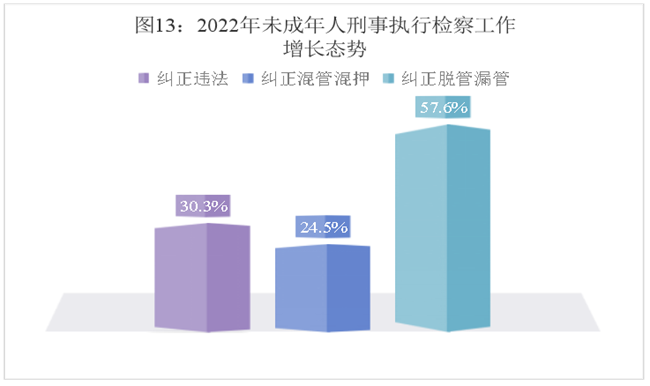 针对看守所监管未成年人活动提出检察建议272件,同比上升30.8%;纠正违法2660件,同比上升30.3%;纠正混管混押3415人,同比上升24.5%。针对未成年犯管教所监管活动提出检察建议32件,同比上升77.8%;纠正减刑、假释、暂予监外执行不当345人。针对未成年人社区矫正活动纠正脱管漏管320人,同比上升57.6%;纠正收监执行不当144人,同比上升67.4%;纠正与成年犯混合执行社区矫正637人,同比上升1.09倍。