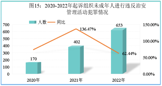 (2)组织未成年人进行违反治安管理活动犯罪数量上升。2020年至2022年,检察机关对组织未成年人进行违反治安管理活动犯罪提起公诉分别为170人、402人、653人,2022年较2021年同比上升62.44%。